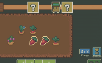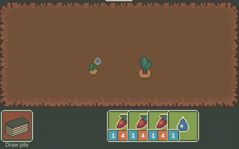 Reoin+Bottaries ftw. Limited space is interesting, but I feel like it really punishes longer-growing plants pretty harshly in the late game. Rain is the best water card by a long shot, obviously. I can't imagine any build for this game that doesn't start off with Sproccoli and then pivot away from it once per-turn energy is 'enough', nor one that doesn't have at least a third its cards be Reoin. That would probably be a bad sign for strategic depth, but this game was made in three days so honestly it's impressive it's as complete and strategically interesting as it is.